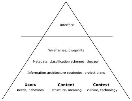 iceberg_s.gif Building on content, context, and users, the authors also illustrate information architecture as an iceberg. Just like an iceberg, the majority of information architecture work is out of sight, "below the water." The work includes the creation of plans, controlled-vocabularies, and blueprints all before any user interfaces are created.